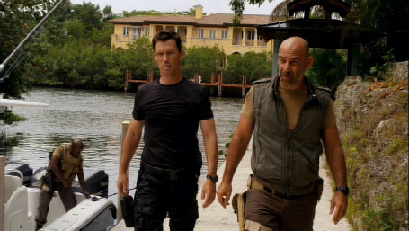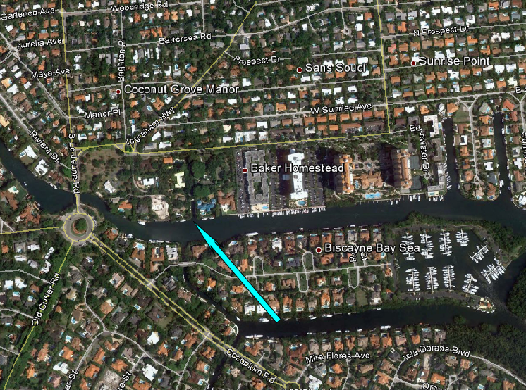 Then we see them arrive at Jackson’s. This was filmed on location at 200 Edgewater Drive, Coral Gables. 6935 Prado Blvd. is seen in the background which is where the photo below right was taken that shoots toward 200 Edgewater Drive.