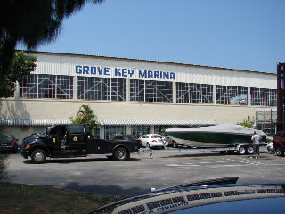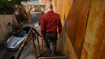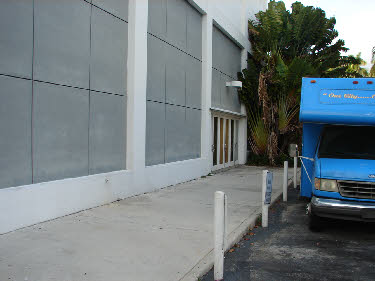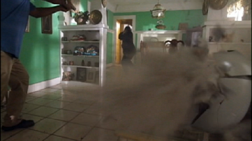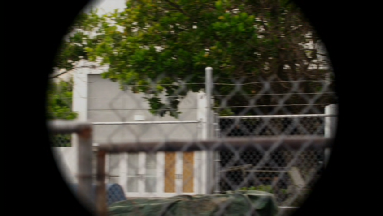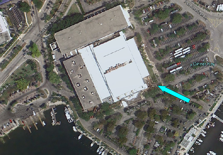 Then we go to the weapons cache. This was also filmed at the studio. Grove Key Marina is seen in the background out the open bay door of the studio.