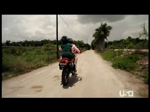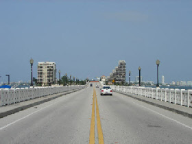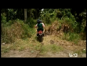 Then we see them coming out of the water. Magically they have moved a little over 5 miles to the northeast, just above the Venetian Causeway. The landmark radio tower on the bay behind the Miami Herald is clearly seen in several shots. They steal a motorcycle and head off north along the bay behind the Double Tree Hotel.